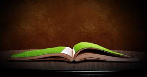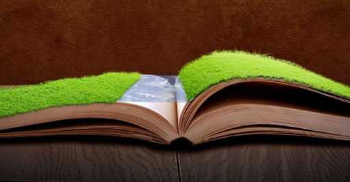 下载一幅常见的绿地蓝天图片 ,调整大小使其只覆盖书本的左边。将图层命名为草地。