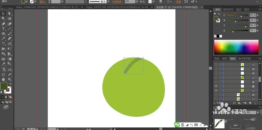 2、选择一片包菜叶子并用嫩绿色填充,再画出顶端的暗光元素路径并用暗绿色填充,设置透明度为20%,模式为正片叠底。