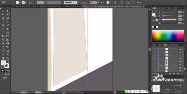 3、接着,我们用黄棕色填充另外的一面墙壁,再开始绘制沙发,先用淡紫灰色填充沙发的扶手。