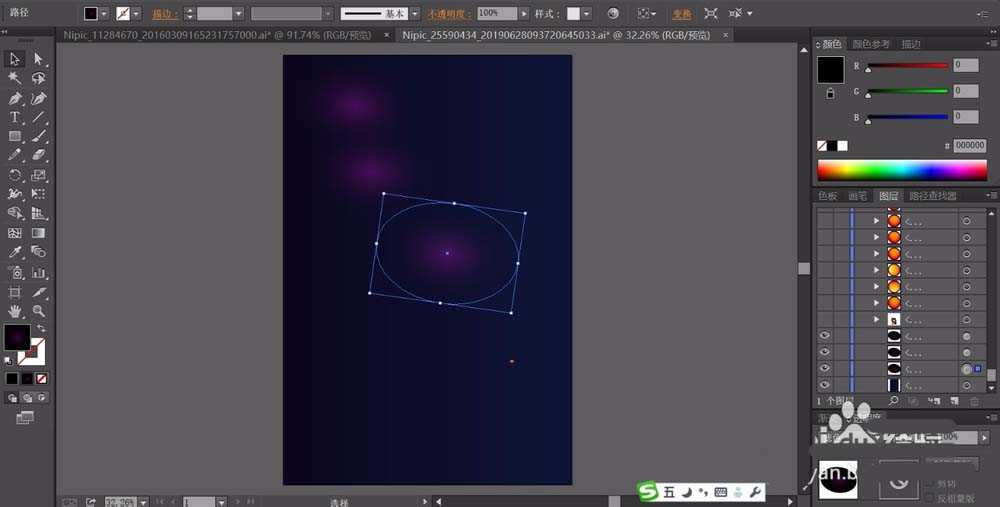 2、我们分别用圆形工具画出蓝色的光影与紫红色的光影在图片的左侧与下方,再使用矩形背景所在的路径与光影做剪切蒙版的效果,让光影自然出现在图片的内部。
